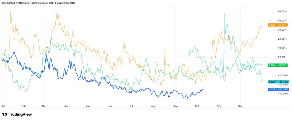 CoinDesk Research notes that 2025’s volatility setup closely mirrors 2023, when it wasn’t until the second half of October that IV began its next major leg higher, rising from an annualized 40% to over 60%.