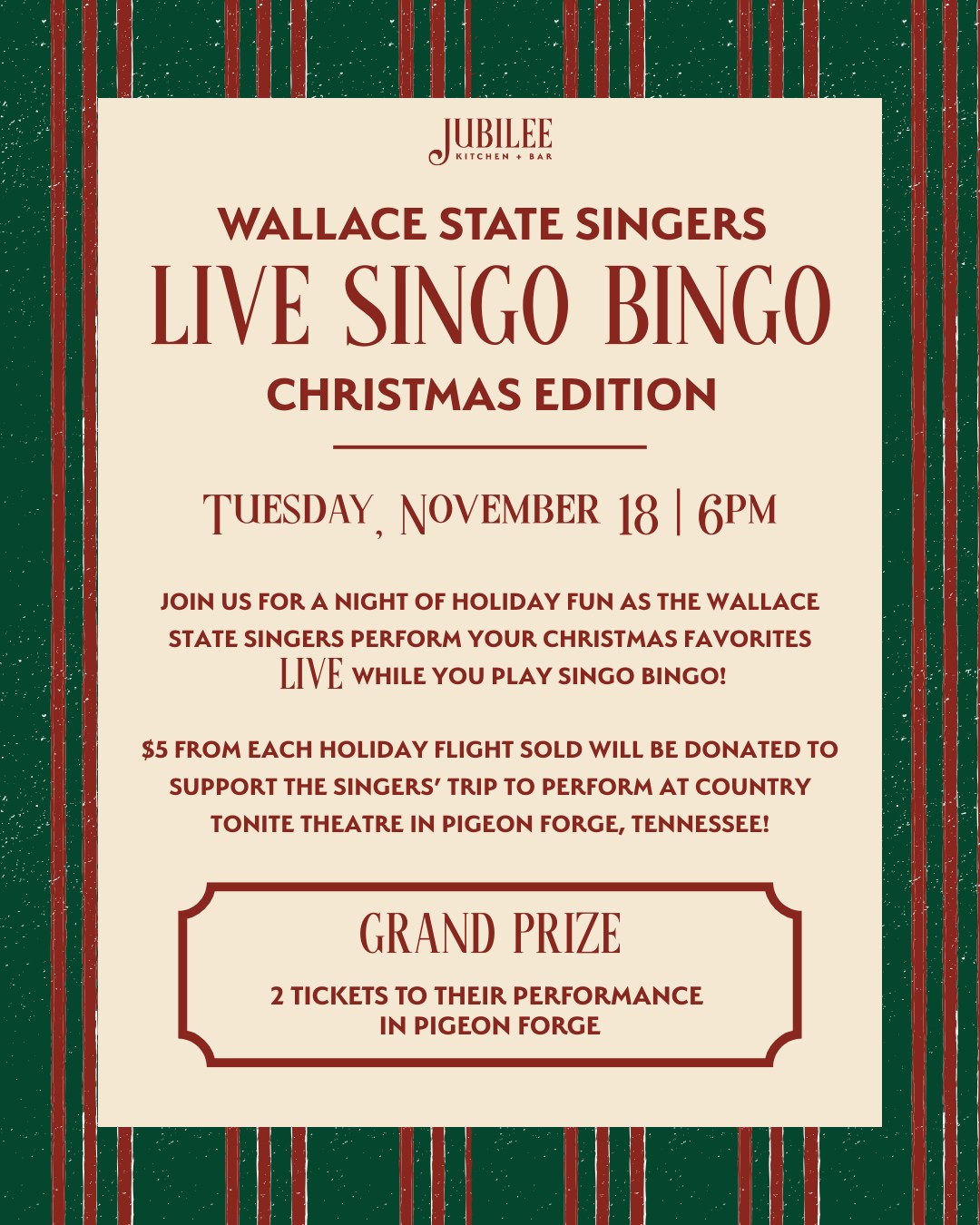 CULLMAN, Ala. – Jubilee Kitchen and Bar will host a Singo Bingo night on Nov. 18, at 6 p.m. as a fundraiser for the Wallace State Singers.
